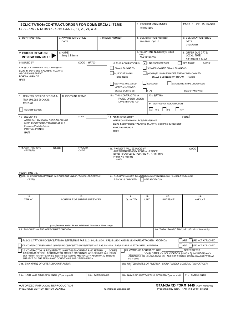 SOLICITATION/CONTRACT/ORDER FOR COMMERCIAL ITEMS OFFER OR TO COMPLETE BLOCKS 12, 17, 23, 24, & 30 2. CONTRACT NO.3. AWARD/ EFFECTIVE DATE7. FOR SOLICITATION INFORMATION CALL:a. NAME Jerry L Etienne9.