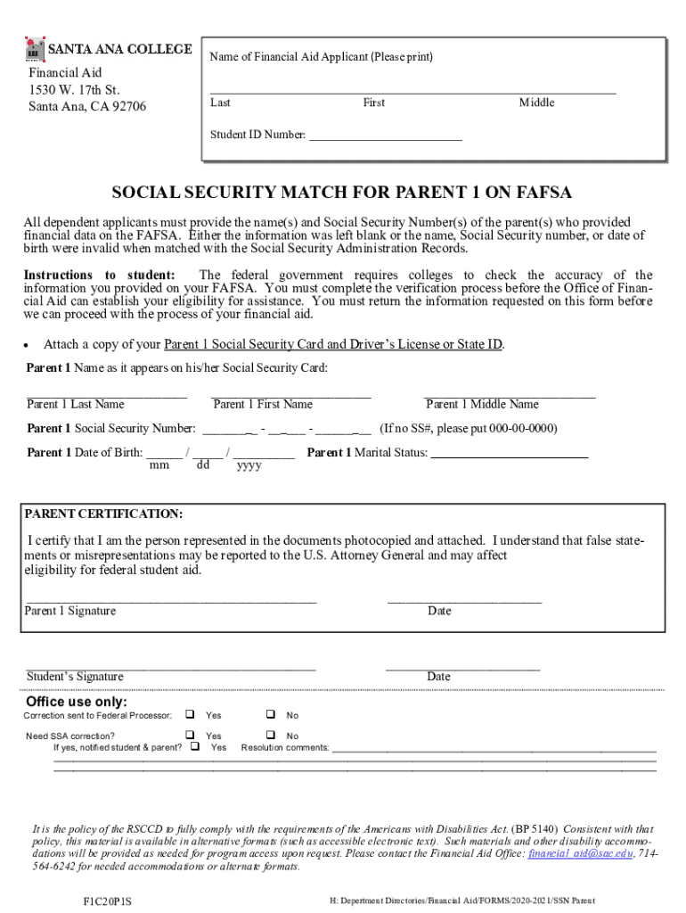 Name of Financial Aid Applicant (Please print)Financial Aid 1530 W. 17th St. Santa Ana, CA 92706 Last First Middle Student ID Number: SOCIAL SECURITY MATCH FOR PARENT 1 ON FAFSA All dependent applicants