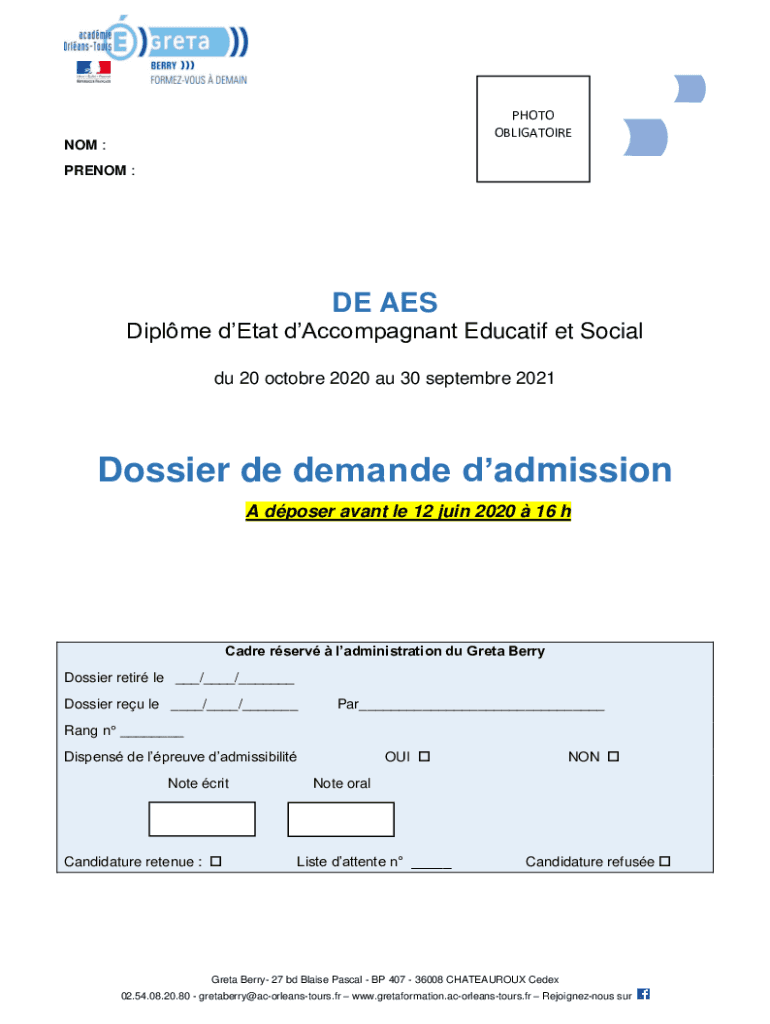 PHOTO OBLIGATOIRENOM : PHENOM :DE AES Diploma deceit dAccompagnant Education et Social Du 20 October 2020 au 30 September 2021Dossier de demanded admission A poser savant LE 12 join 2020 16 cadres