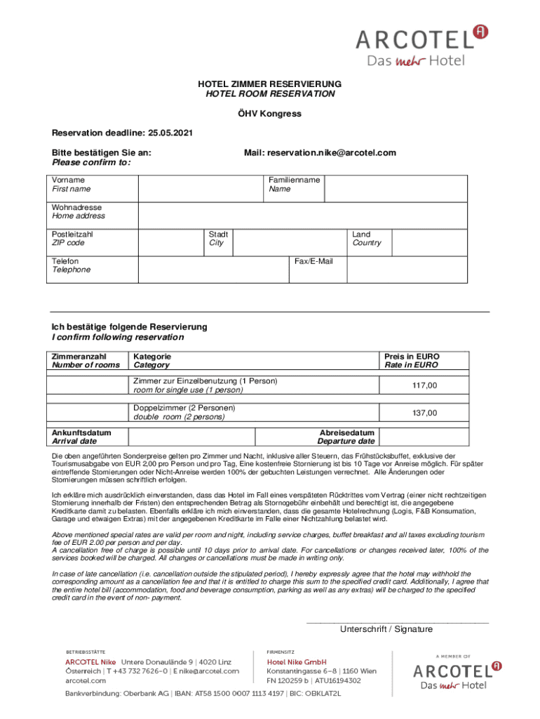 Please confirm to:Mail: reservation.nike@arcotel.comVorname