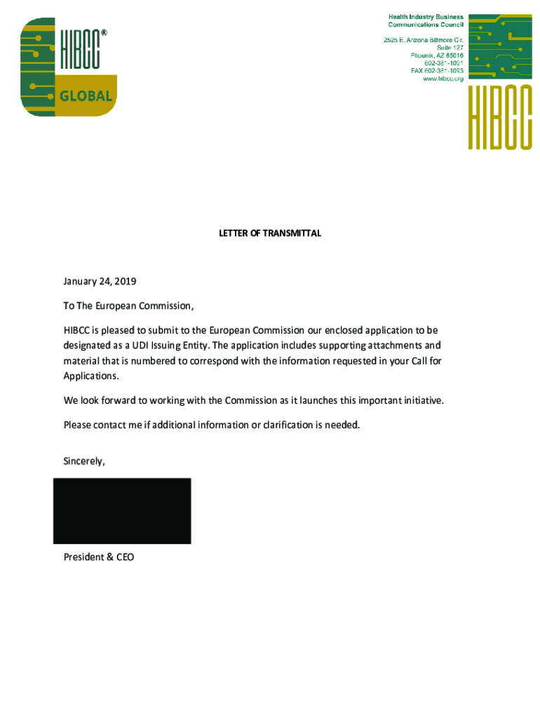 LETTEROFTRANSMITTAL January24,2019 ToTheEuropeanCommission, HIBCCispleasedtosubmittotheEuropeanCommissionourenclosedapplicationtobe designatedasaUDIIssuingEntity. Theapplicationincludessupportingattachmentsand