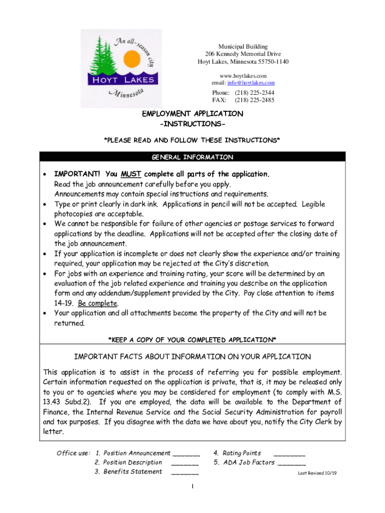 Municipal Building 206 Kennedy Memorial Drive Host Lakes, Minnesota 557501140 www.hoytlakes.com email: info hotcakes.compose: (218) 2252344 FAX: (218) 2252485EMPLOYMENT APPLICATION INSTRUCTIONS×PLEASE