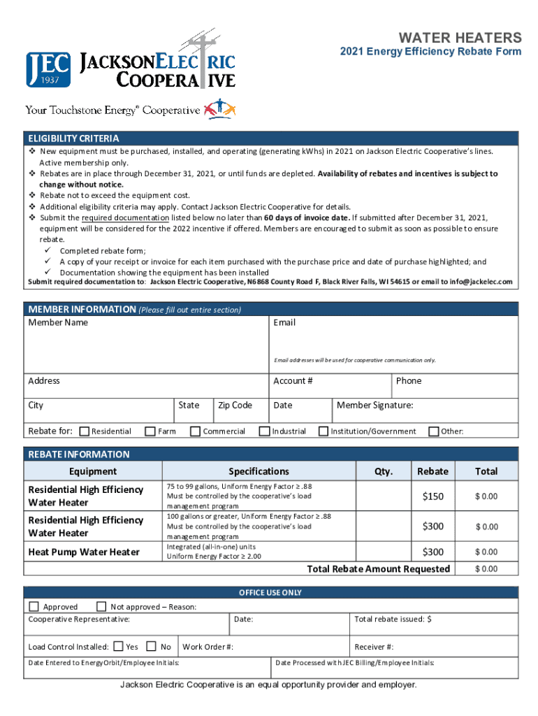 WATER HEATERS2021 Energy Efficiency Rebate FormELIGIBILITY CRITERIA New equipment must be purchased, installed, and operating (generating kWh's) in 2021 on Jackson Electric Cooperatives lines. Active