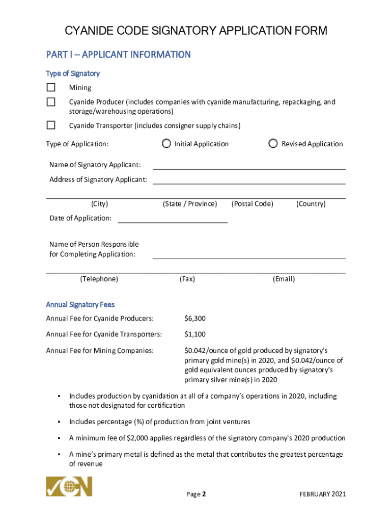 INTERNATIONAL CYANIDE MANAGEMENT INSTITUTE SIGNATORY APPLICATION FORM FOR THE INTERNATIONAL CYANIDE MANAGEMENT CODE February 2021INTERNATIONAL CYANIDE MANAGEMENT INSTITUTE 1400 I Street, NW, Suite