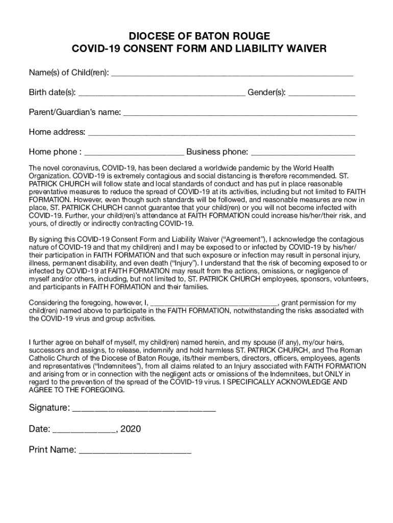 Get the free DIOCESE OF BATON ROUGE COVID-19 CONSENT FORM AND LIABILITY ...