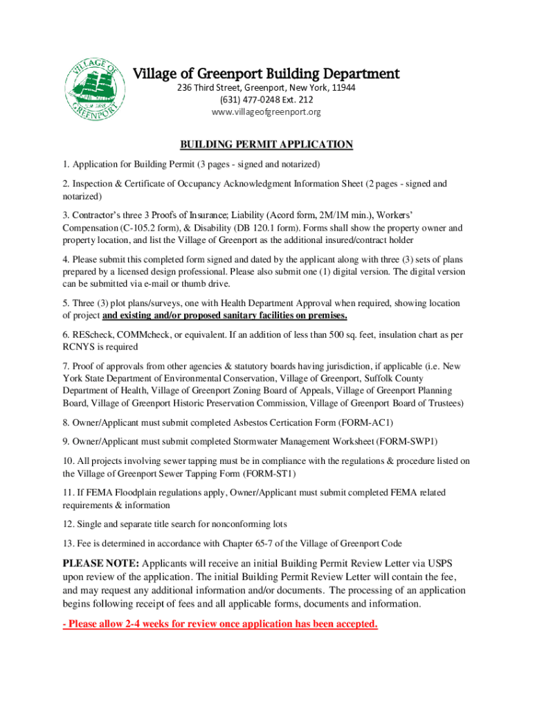 Village of Green port Building Department 236 Third Street, Green port, New York, 11944 (631) 4770248 Ext. 212 www.villageofgreenport.orgBUILDING PERMIT APPLICATION 1. Application for Building Permit