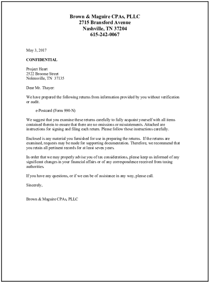 Brown & Maguire CPA's, LLC 2715 Bransford Avenue Nashville, TN 37204 6152420067 May 3, 2017, CONFIDENTIAL Project Heart 2522 Brooke Street Noblesville, TN 37135 Dear Mr. Thayer: We have prepared the