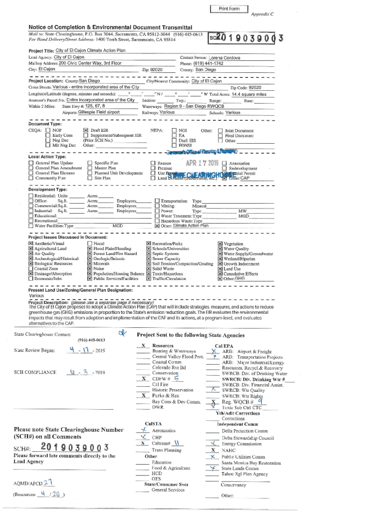 Print Form Appendix Notice of Completion & Environmental Document Transmittal Mail to: State Clearinghouse, P.O. Box 3044, Sacramento, CA 958123044 (916) 4450613 For Hand Delivery/Street Address: