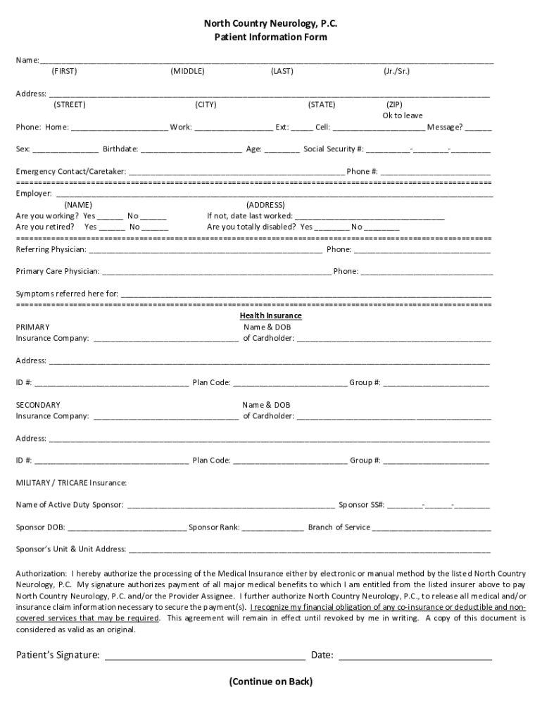 North Country Neurology, P.C. Patient Information Form Name: (FIRST) (MIDDLE) (LAST) (Jr./Sr.) Address: (STREET) (CITY) (STATE) (ZIP) Ok to leave Phone: Home: Work: Ext: Cell: Message? Sex: Birthdate:
