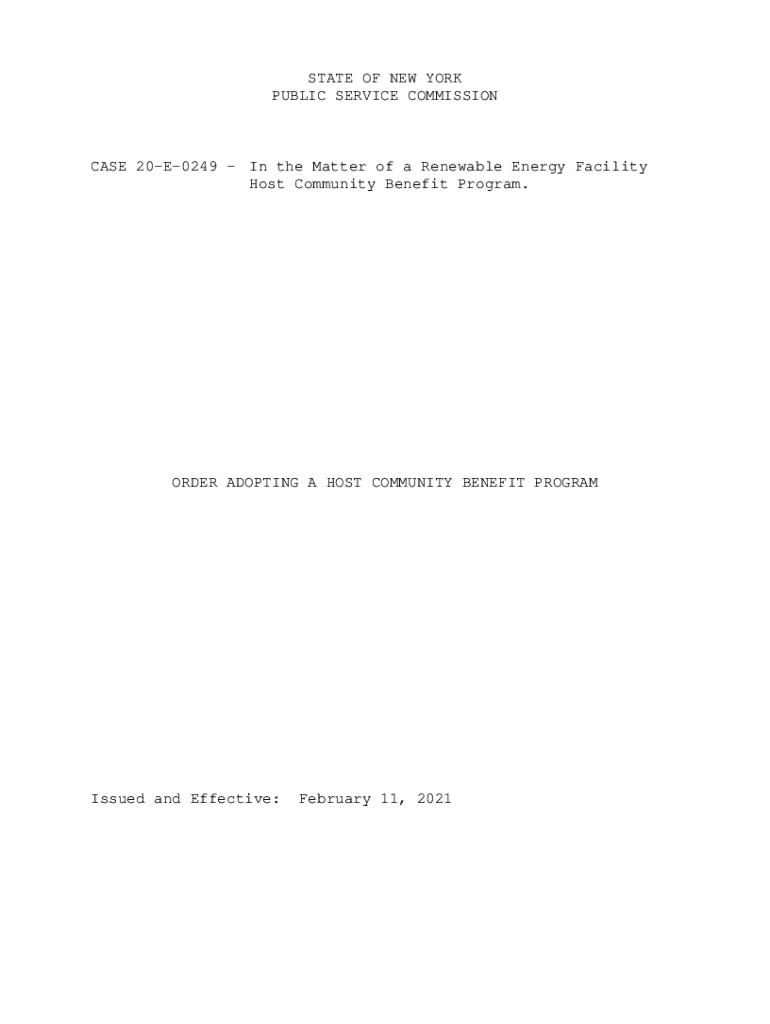 STATE OF NEW YORK PUBLIC SERVICE COMMISSION CASE 20E0249 In the Matter of a Renewable Energy Facility Host Community Benefit Program. ORDER ADOPTING A HOST COMMUNITY BENEFIT PROGRAMIssued and Effective:February