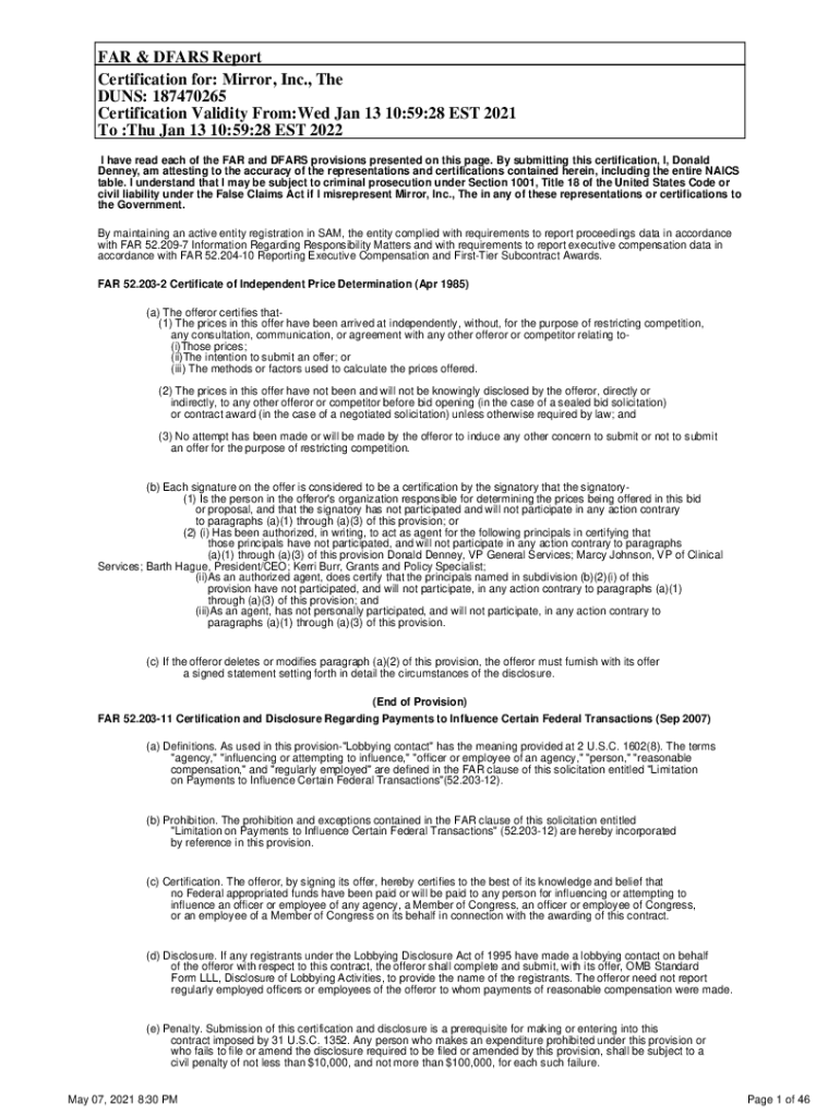 FAR & DEARS Report Certification for: Mirror, Inc., The DUNS: 187470265 Certification Validity From:Wed Jan 13 10:59:28 EST 2021 To :Thu Jan 13 10:59:28 EST 2022 I have read each of the FAR and DEARS
