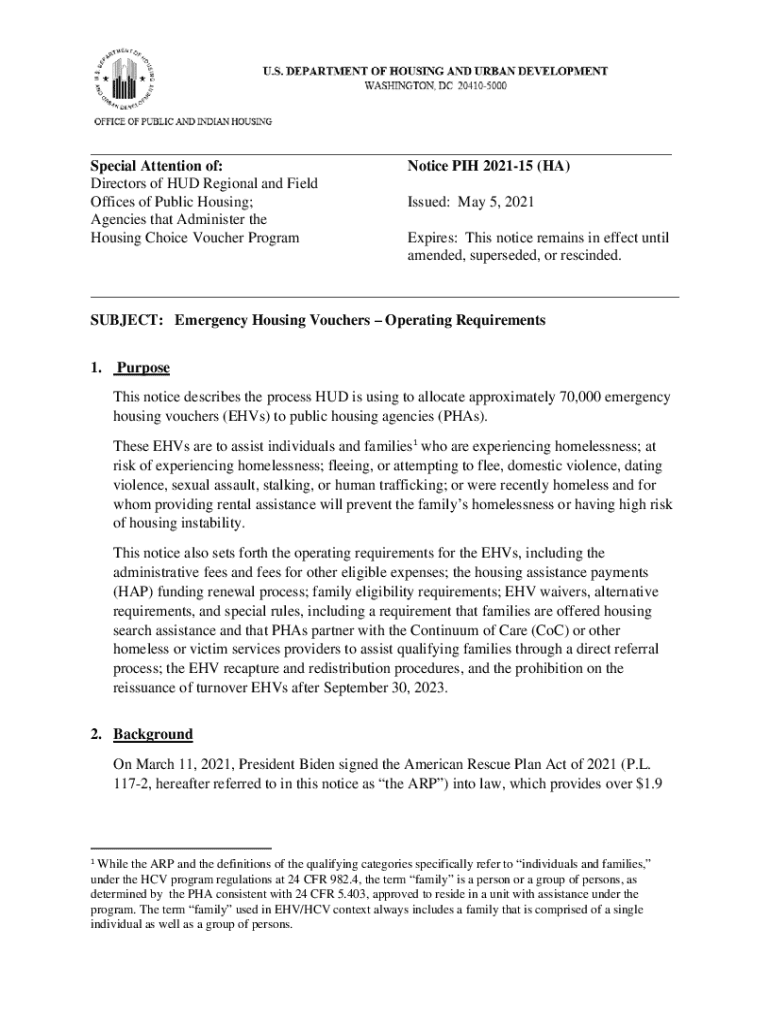 Special Attention of: Notice PIN 202115 (HA) Directors of HUD Regional and Field Offices of Public Housing; Issued: May 5, 2021, Agencies that Administer the Housing Choice Voucher Program Expires: