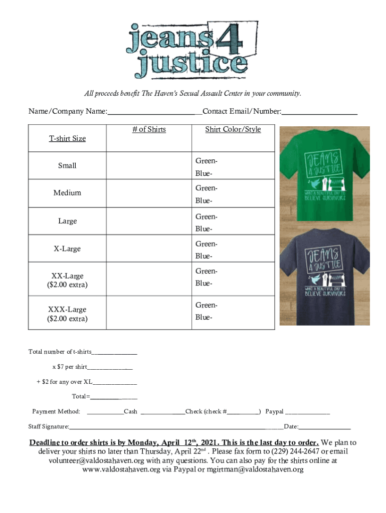 All proceeds benefit The Havens Sexual Assault Center in your community. Name/Company Name: Contact Email/Number: # of ShirtsShirt Color/Stylesheet Size GreenSmallBlueGreenMediumBlueGreenLargeBlueGreenXLargeBlueGreenXXLarge