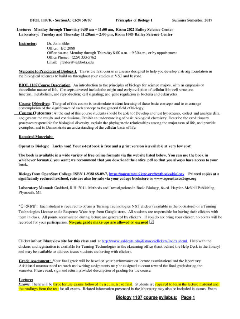 Get the free Biology 1107 course syllabus; Page 1 - Valdosta State University