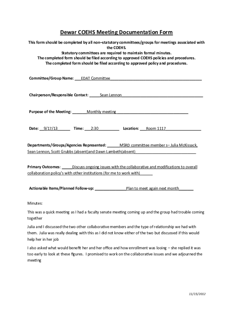 Dewar COEDS Meeting Documentation Form This form should be completed by all nonstatutory committees/groups for meetings associated with the COEDS. Statutory committees are required to maintain formal