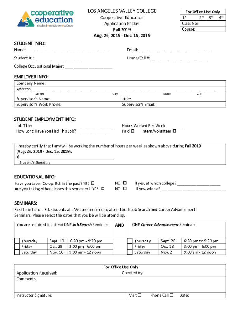 LOS ANGELES VALLEY College Office Use Only 1st 2nd 3rd 4th Class NBR: Course:Cooperative Education Application Packet Fall 2019 Aug. 26, 2019 Dec. 15, 2019STUDENT INFO: Name: Email: Student ID: Home/Cell