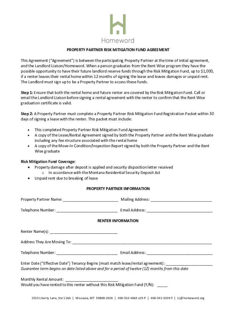 Get the free PROPERTY PARTNER RISK MITIGATION FUND AGREEMENT