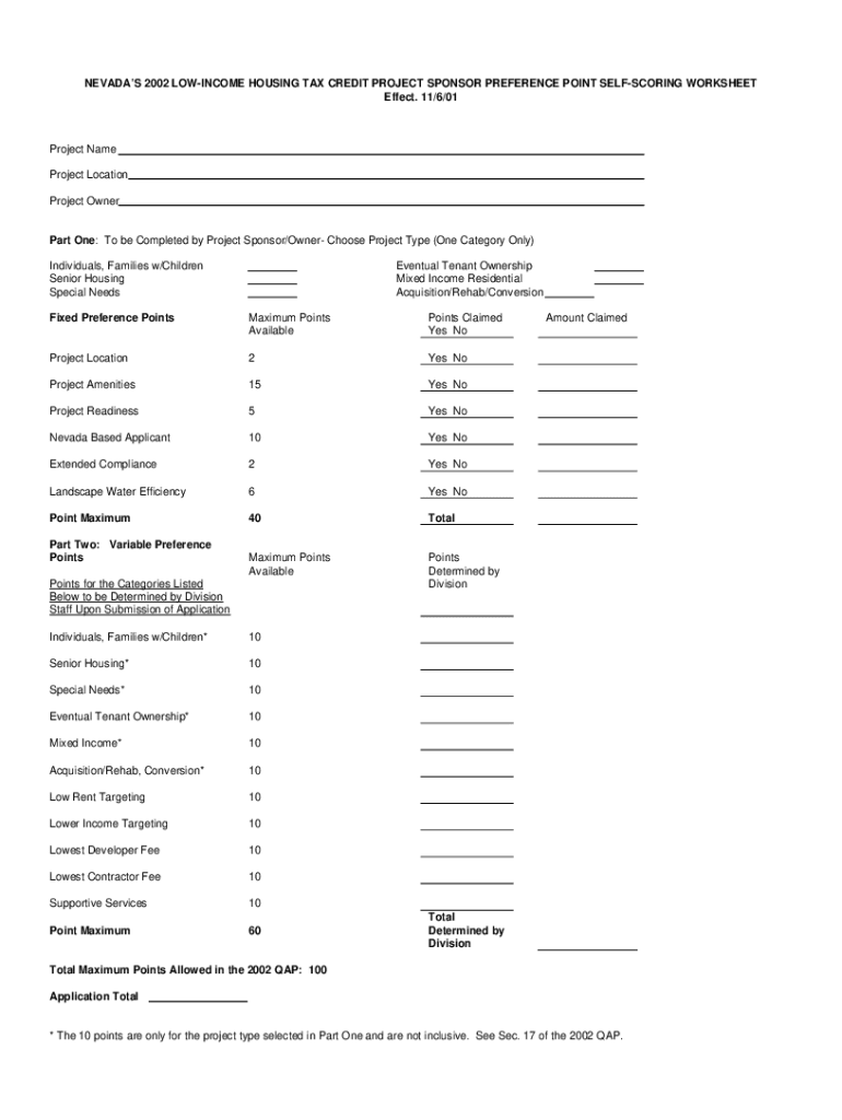 NEVADA 2002 INCOME HOUSING TAX CREDIT PROJECT SPONSOR PREFERENCE POINT TELESCOPING WORKSHEET