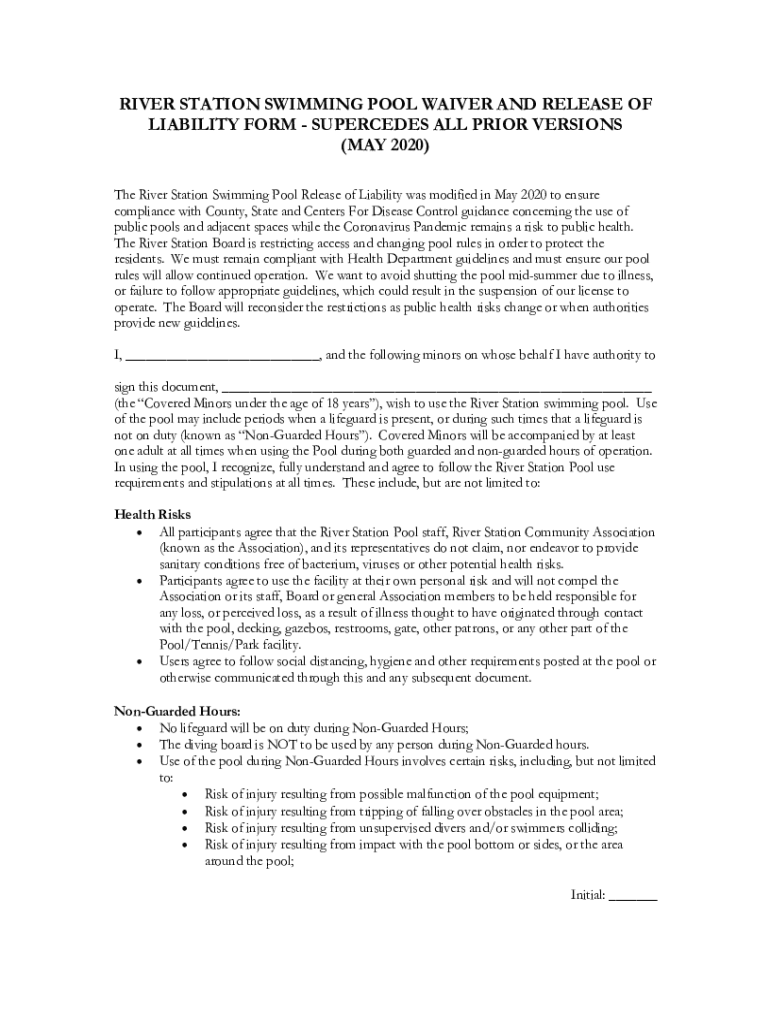 RIVER STATION SWIMMING POOL WAIVER AND RELEASE OF LIABILITY FORM SUPERSEDES ALL PRIOR VERSIONS (MAY 2020) The River Station Swimming Pool Release of Liability was modified in May 2020 to ensure compliance