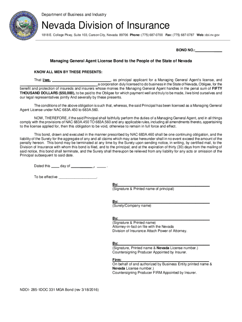 Department of Business and Industry Nevada Division of Insurance 1818 E. College Pkwy, Suite 103, Carson City, Nevada 89706 Phone: (775) 6870700 Fax: (775) 6870787 Web: DOI.NV.good NO.: Managing General