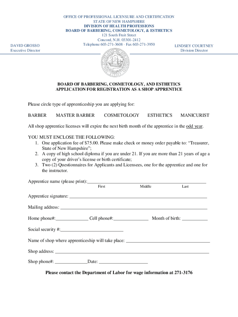 OFFICE OF PROFESSIONAL LICENSURE AND CERTIFICATION STATE OF NEW HAMPSHIRE DIVISION OF HEALTH PROFESSIONS BOARD OF BARBERING, COSMETOLOGY, & AESTHETICS 121 South Fruit Street Concord, N.H. 033012412