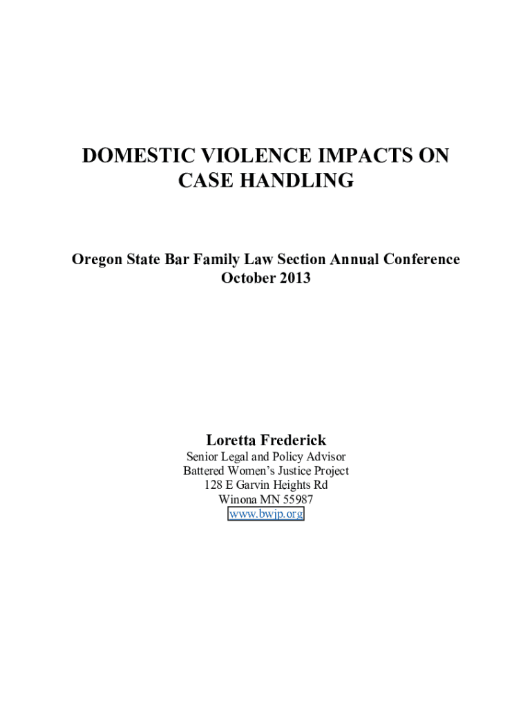 DOMESTIC VIOLENCE IMPACTS ON CASE HANDLING Oregon State Bar Family Law Section Annual Conference October 2013Loretta Frederick Senior Legal and Policy Advisor Battered Women's Justice Project 128