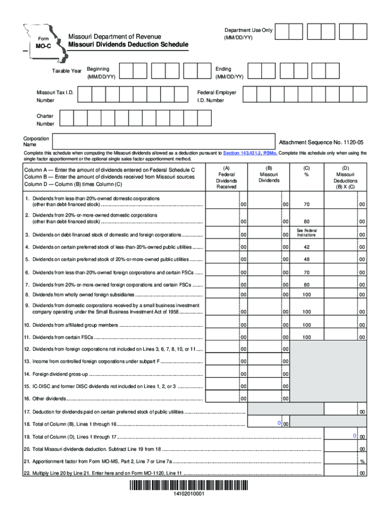 Missouri Dividends Deduction ScheduleFormMOCTaxable Reprint FormBeginningEnding(MM/DD/BY)(MM/DD/BY)Missouri Tax I.D. Federal