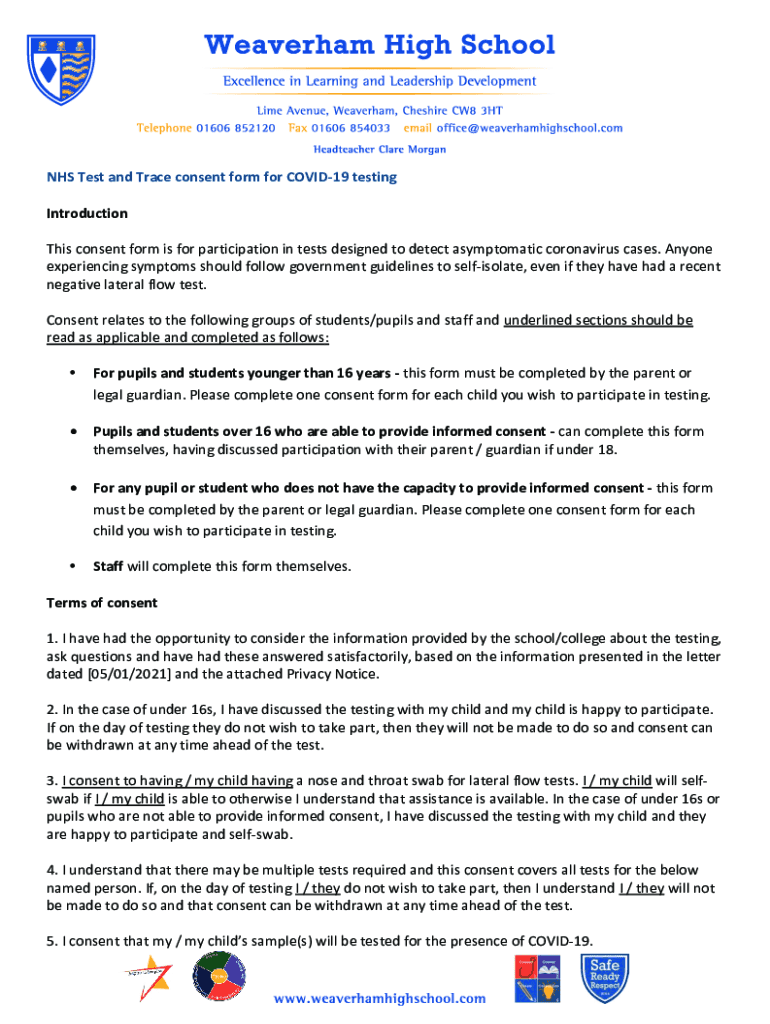 This consent form is for participation in tests designed to detect asymptomatic coronavirus cases. Anyone