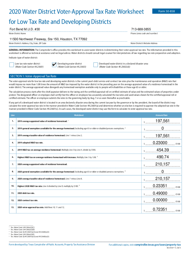 2020 Water District VoterApproval Tax Rate WorksheetForm 50858for Low Tax Rate and Developing Districts Fort Bend M.U.D. #30 Water District Name7136883855 Phone (area code and number)11500 Northwest