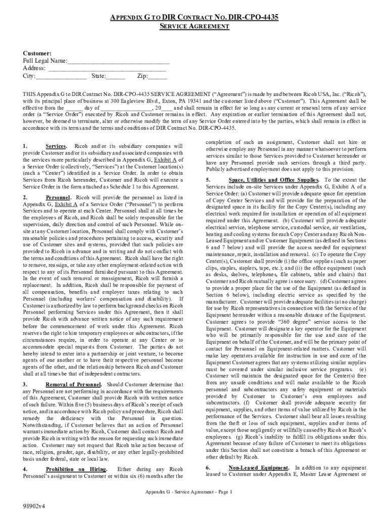 APPENDIX G TO DIR CONTRACT NO. DIRCPO4435 SERVICE AGREEMENT Customer: Full Legal Name: Address: City: State: Zip: THIS Appendix G to DIR Contract No. DIRCPO4435 SERVICE AGREEMENT (Agreement) is made