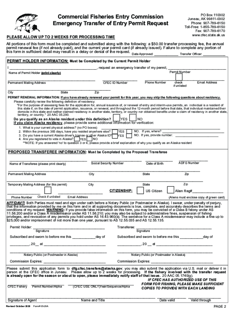 Commercial Fisheries Entry Commission Instructions for Emergency Transfer of Entry Permit Request PO Box 110302 Juneau, AK 998110302 Phone: 9077896150 Toll-free: 18557896150 Fax: 9077896170 www.cfec.state.ak.usGeneral