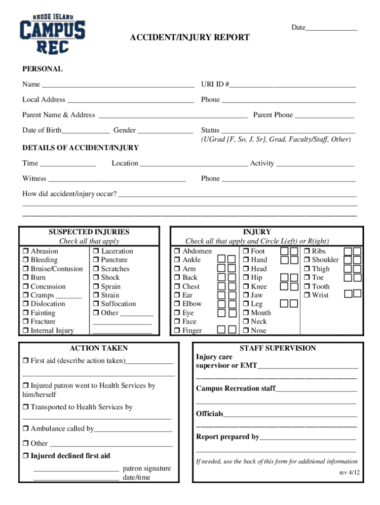 Date ACCIDENT/INJURY REPORTPERSONAL Name URI ID # Local Address Phone Parent Name & Address Parent Phone Date of Birth Gender Status (Grad F, So, J, Sr, Grad, Faculty/Staff, Other)DETAILS OF ACCIDENT/INJURY