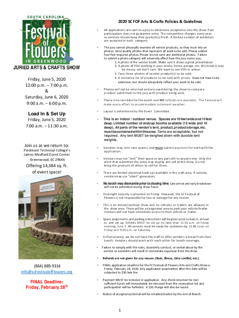 2020 SC FOF Arts & Crafts Policies & Guidelines All applications are sent to a jury to determine acceptance into the show. Past participation does not guarantee entry. The competition changes every