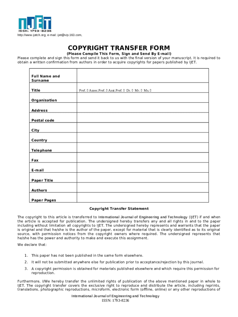 The IJET International Journal of Engineering and Techniques ...IJET - International Journal of Engineering and TechnologyIJET International Journal of Engineering and Techniques ...IJET - International Journal of Engineering and Technology is a Word document that should be submitted to the relevant address in order to provide some info. It needs to be filled-out and signed, which can be done manually, or using a certain software e. g. PDFfiller. This tool lets you fill out any PDF or Word document directly in your browser, customize it according to your purposes and put a legally-binding electronic signature. Once after completion, you can send the IJET International Journal of Engineering and Techniques ...IJET - International Journal of Engineering and TechnologyIJET International Journal of Engineering and Techniques ...IJET - International Journal of Engineering and Technology to the relevant receiver, or multiple ones via email or fax. The editable template is printable too due to PDFfiller feature and options proposed for printing out adjustment. In both digital and physical appearance, your form should have a clean and professional appearance. It's also possible to turn it into a template for further use, so you don't need to create a new file from the beginning. All you need to do is to amend the ready sample.
