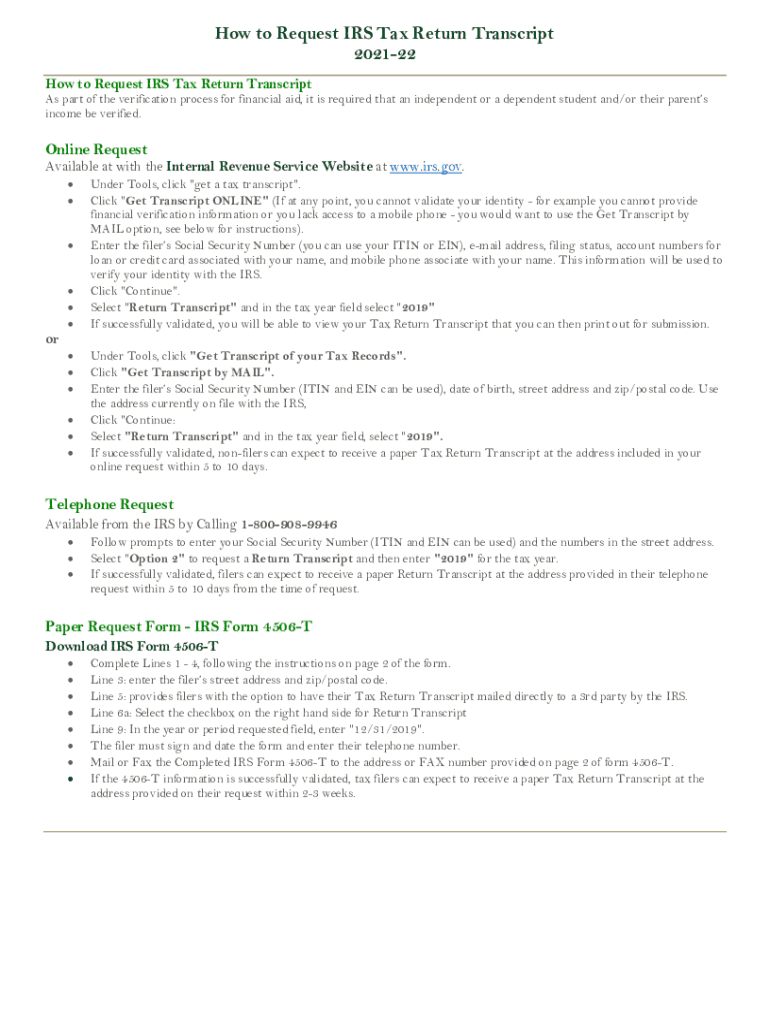 How to Request IRS Tax Return Transcript 202122 How to Request IRS Tax Return Transcripts part of the verification process for financial aid, it is required that an independent or a dependent student