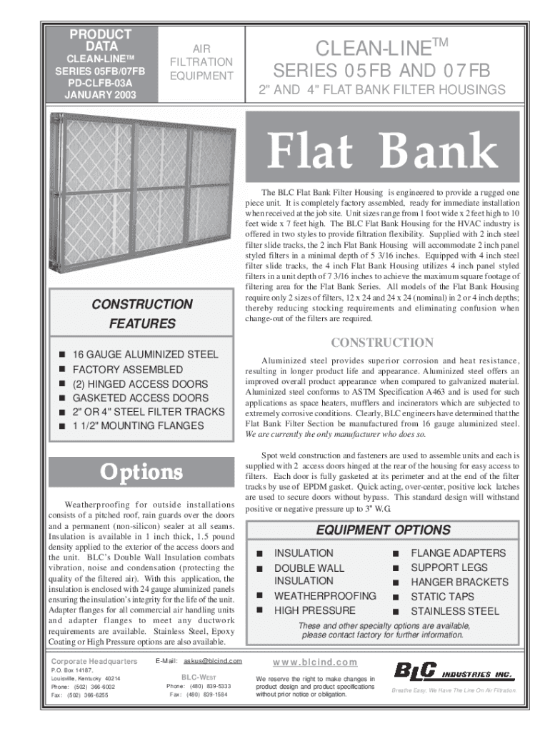 PRODUCT DATA CLEANLINESS SERIES 05FB/07FB PDCLFB03A JANUARY 2003CLEANLINETMAIR FILTRATION EQUIPMENTSERIES 05FB AND 07FB 2 AND 4 FLAT BANK FILTER HOUSINGSFlat Bank. . .CONSTRUCTION Features BLC Flat