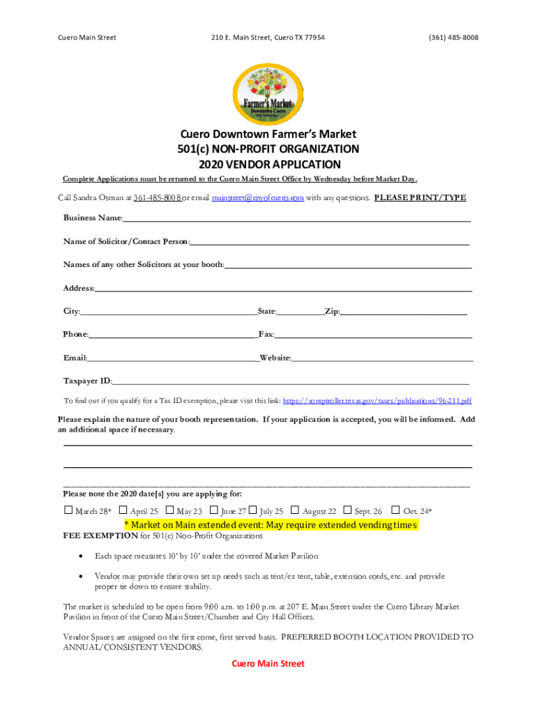 Hero Main Street210 E. Main Street, Hero TX 77954(361) 4858008Cuero Downtown Farmers Market 501(c) NONPROFIT ORGANIZATION 2020 VENDOR APPLICATION Complete Applications must be returned to the Hero