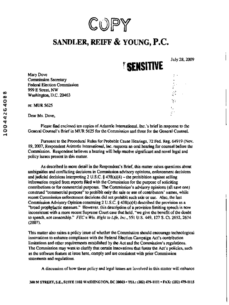 SANDLER, RIFF & YOUNG, P.C.SENSITIVE Otto f TF OO Mary Dove Commission Secretary Federal Election Commission 999 E Street, NW Washington, D.C. 20463re: MUR 5625July 28, 2009 :; Tidier Ms. Dove, Please