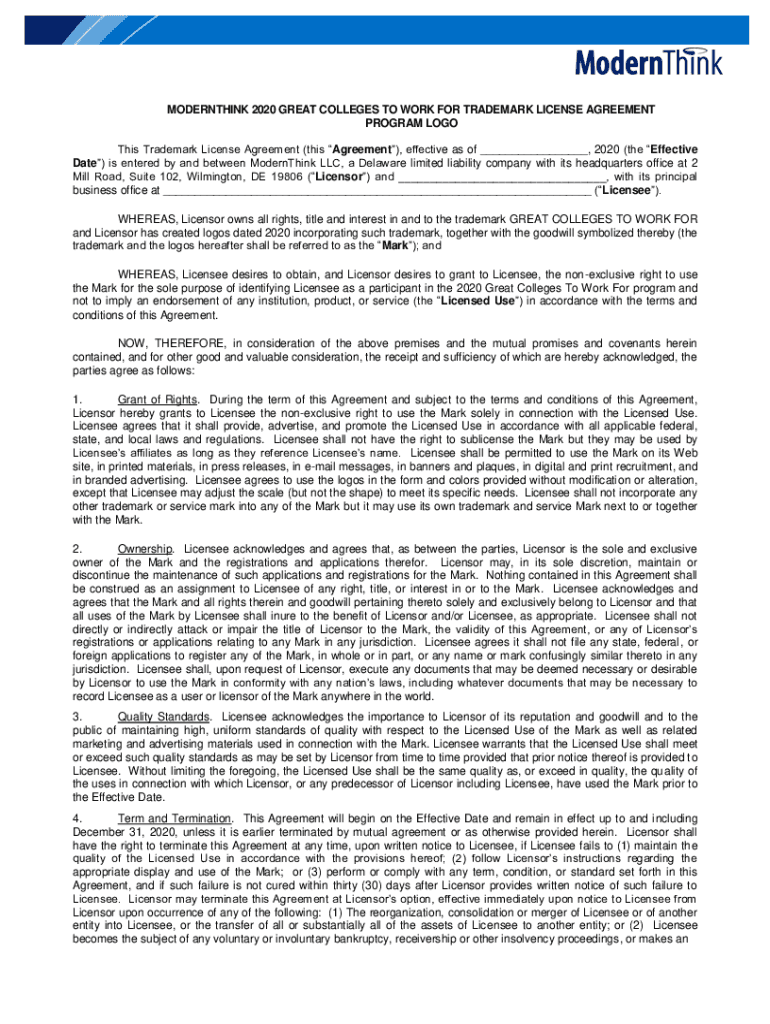 MODERNIZING 2020 GREAT COLLEGES TO WORK FOR TRADEMARK LICENSE AGREEMENT PROGRAM LOGO This Trademark License Agreement (this Agreement), effective as of, 2020 (the Effective Date) is entered by and