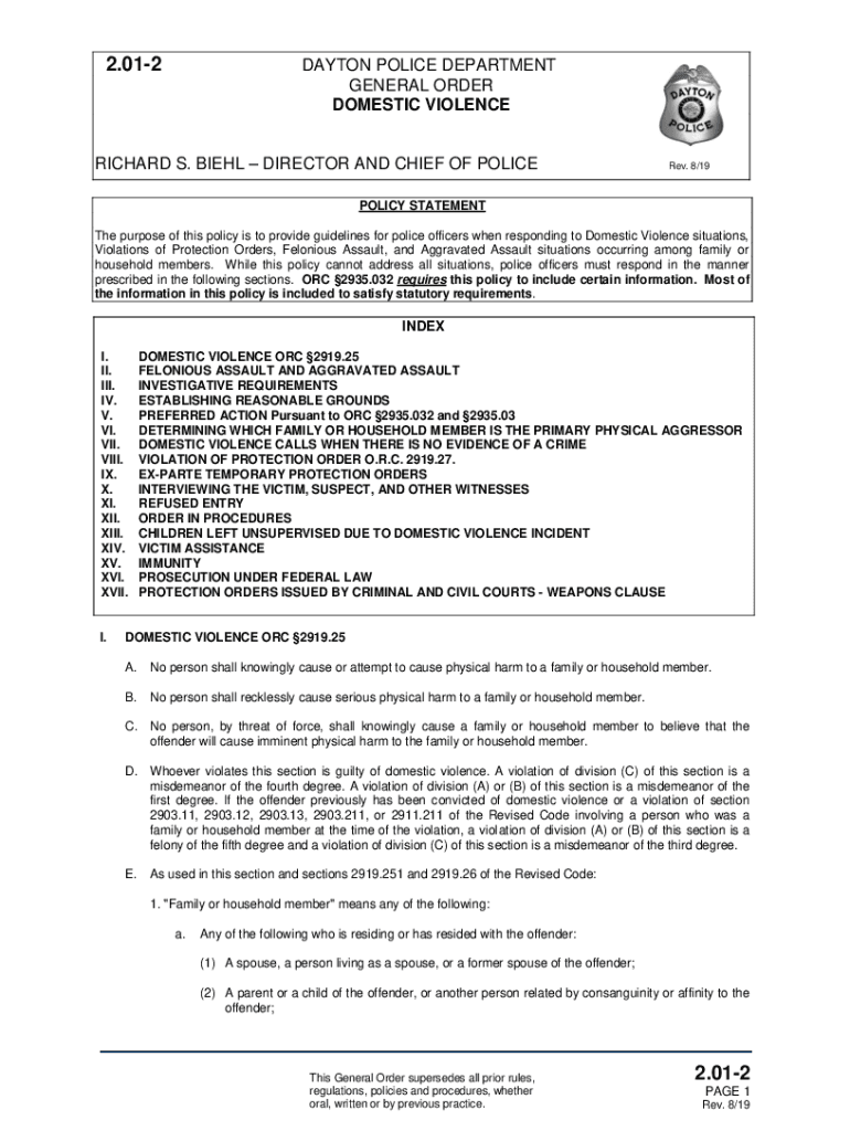 2.012DAYTON POLICE DEPARTMENT GENERAL ORDER DOMESTIC VIOLENCERICHARD S. BI EHL DIRECTOR AND CHIEF OF POLICE Rev. 8/19POLICY STATEMENT The purpose of this policy is to provide guidelines for police