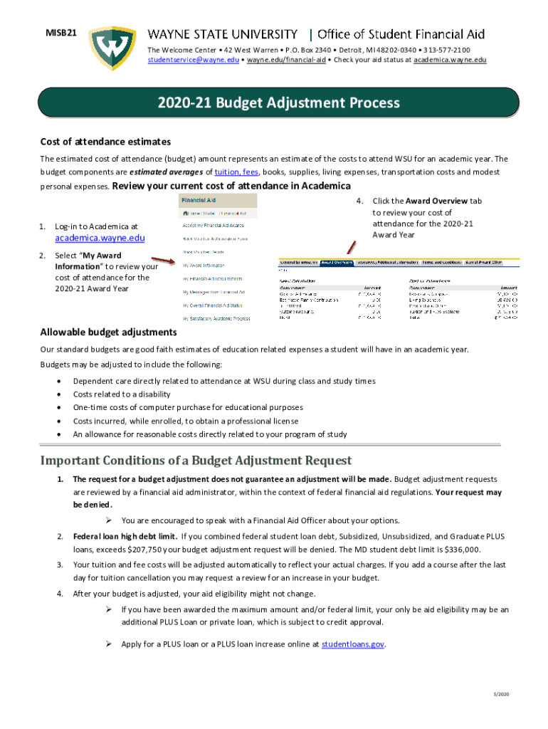 MISB21 The Welcome Center 42 West Warren P.O. Box 2340 Detroit, MI 482020340 3135772100 student service Wayne.edu wayne.edu/financialaid Check your aid status at academic. Wayne.edu202021 Budget Adjustment