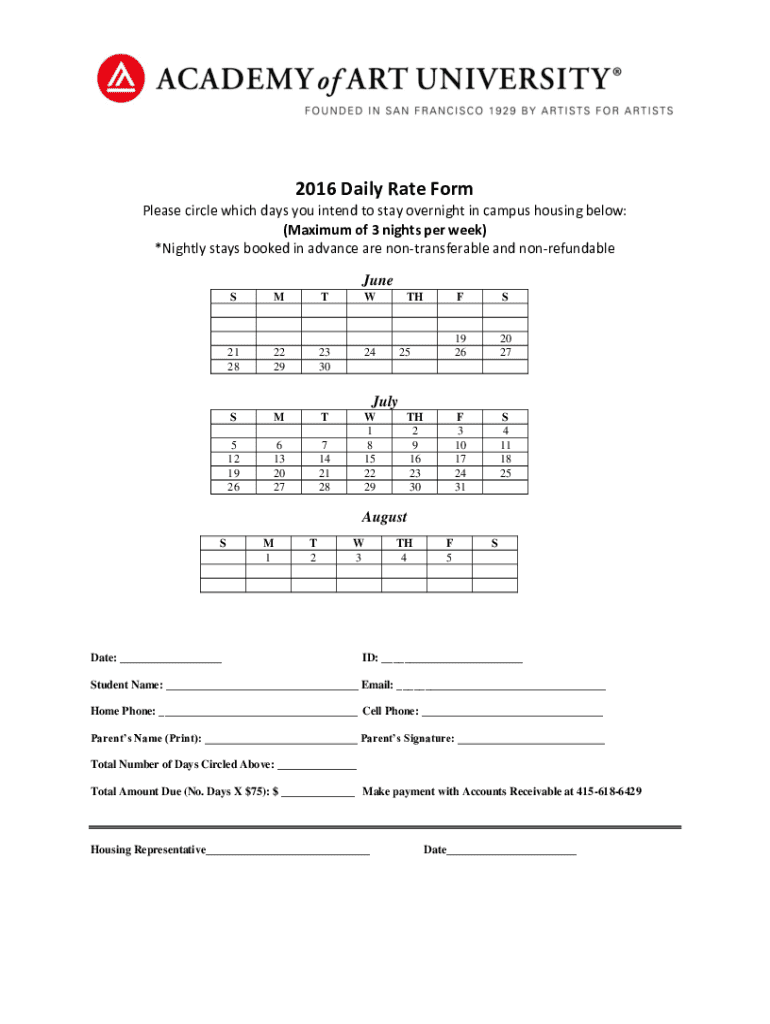 2016 Daily Rate Form Please circle which days you intend to stay overnight in campus housing below: (Maximum of 3 nights per week) *Nightly stays booked in advance are nontransferable and nonrefundable