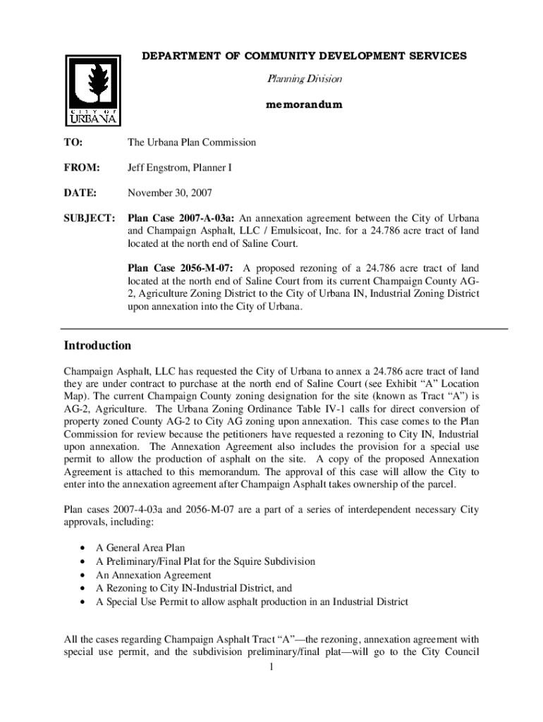 memorandum TO:The Urbana Plan Commissioner:Jeff Angstrom, Planner IDATE:November 30, 2007SUBJECT:Plan Case 2007A03a: An annexation agreement