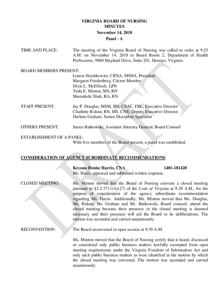 VIRGINIA BOARD OF NURSING MINUTES November 14, 2018, Panel A TIME AND PLACE:The meeting of the Virginia Board of Nursing was called to order at 9:25 A.M. on November 14, 2018, in Board Room 2, Department