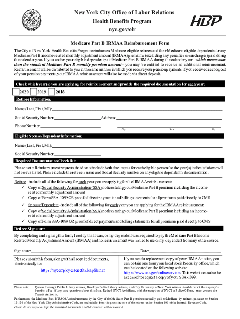 New York City Office of Labor Relations Health Benefits Program nyc.gov/olr Medicare Part B IRMA Reimbursement Form The City of New York Health Benefits Program reimburses Medicare eligible retirees