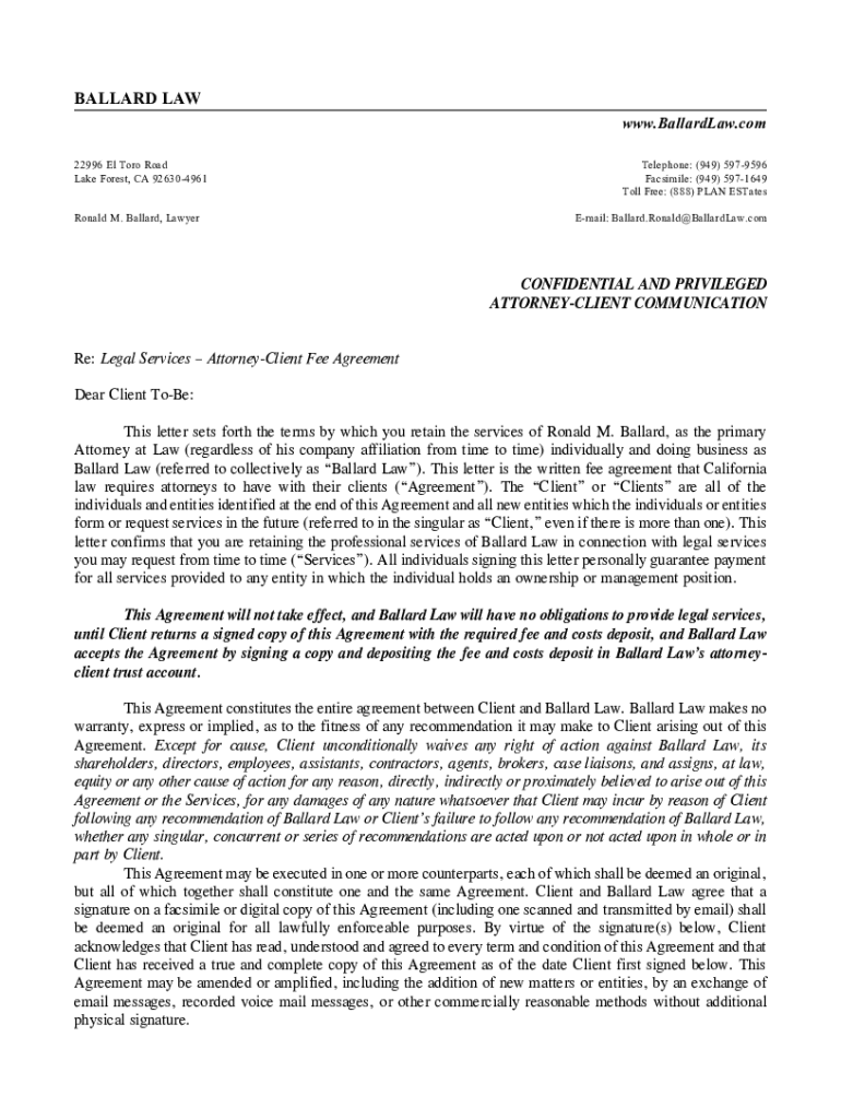 BALLARD LAW www.BallardLaw.com 22996 El Too Road Lake Forest, CA 926304961Ronald M. Ballard, LawyerTelephone: (949) 5979596 Facsimile: (949) 5971649 Toll Free: (888) PLAN Estates Email: Ballard. Ronald