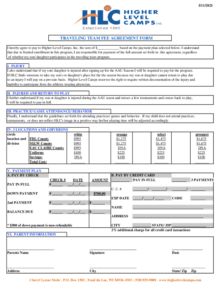 3/11/2021TRAVELING TEAM FEE AGREEMENT FORM I hereby agree to pay to Higher Level Camps, Inc. the sum of $ based on the payment plan selected below. I understand that due to limited enrollment in this