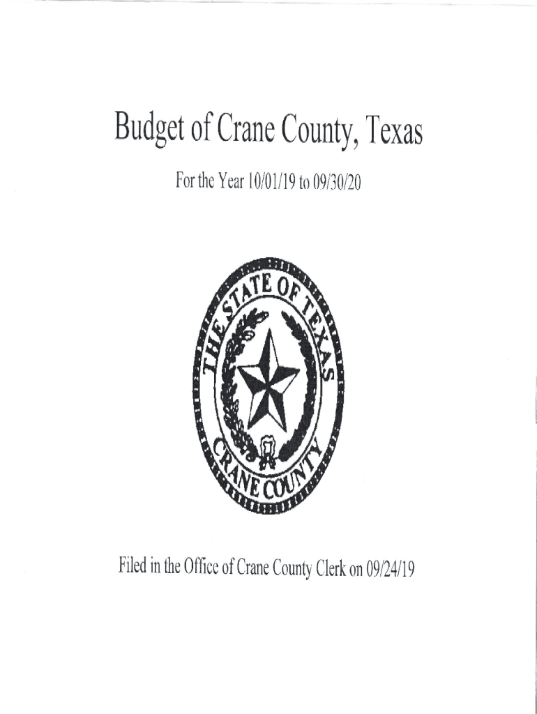 For the Year l0l01rl19 to 09130120Filed in the Office of Crane County Clerk on09124119INDEX TO CRANE COUNTY BUDGET YEAR 2019 AND FOR FISCAL YEAR END 2O2O