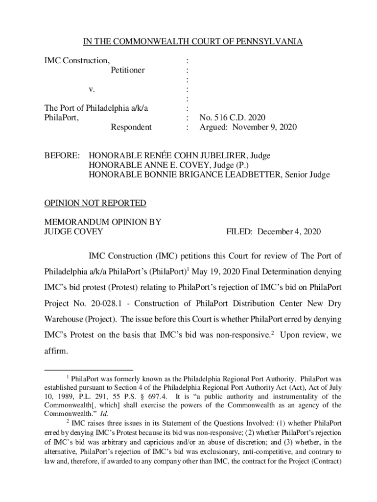 Get the free IN THE COMMONWEALTH COURT OF PENNSYLVANIA IMC Construction ...