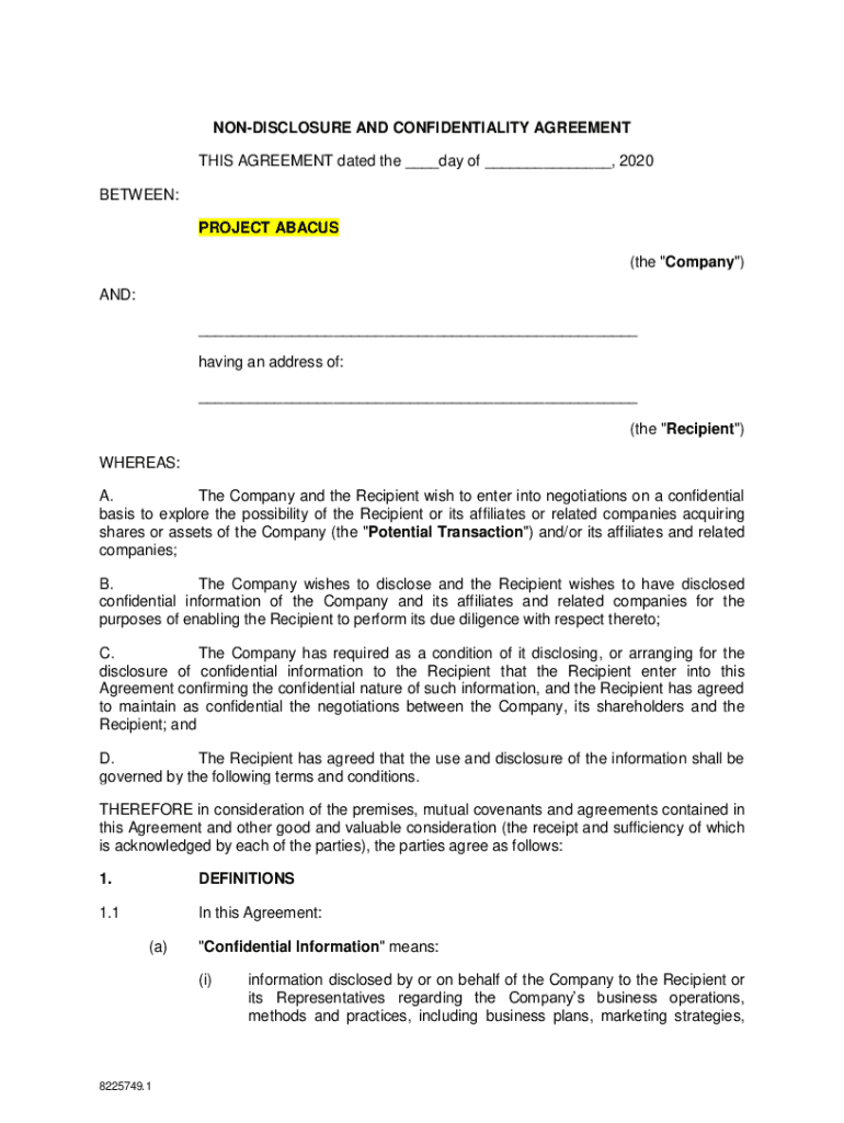 NONDISCLOSURE AND CONFIDENTIALITY AGREEMENT THIS AGREEMENT dated the day of, 2020 BETWEEN: PROJECT ABACUS (the “Company “) AND: having an address of: (the “Recipient “) WHEREAS: A. The Company